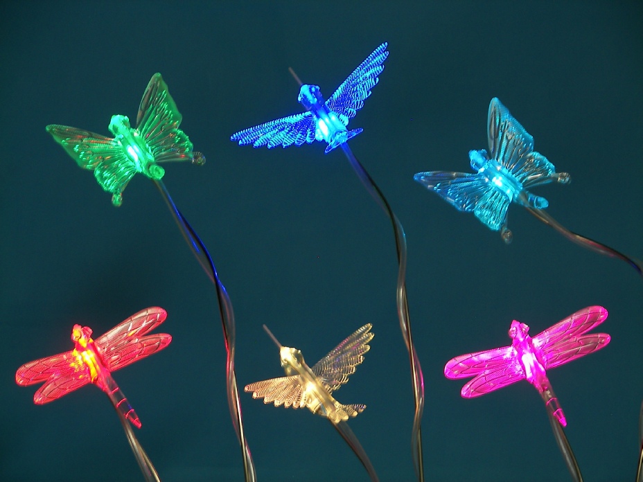 Color Changing LED Water Spitters Lights with Hummingbird, Butterfly, Dragonfly shapes Non-Yellowing Crystal Clear Acrylic Sculptures